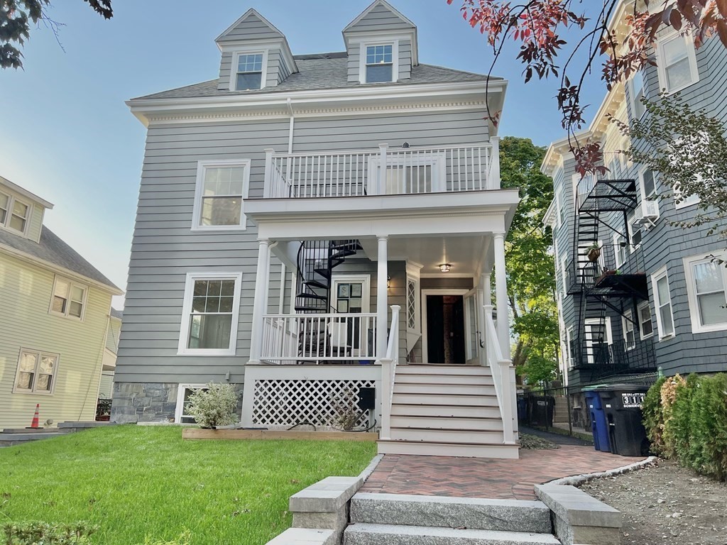 AVAILABLE immediately! A rare gem on a quiet street with lovingly restored period details throughout, this ~2,000 sqft STUNNING high-end gut renovated 3+ bedroom/2.5 bath townhouse TRIPLEX welcomes you with a porch entry to a grand mud room & libary/office foyer with fireplace, built in shelves, and half bathroom. The dramatic staircase with stained glass windows leads you to the open concept chef’s kitchen/dining/living floor with granite countertops, stainless steel appliances, pantry room, and a large outdoor deck. On the top floor with Boston city skyline views, the cathedral ceiling primary bedroom with en-suite skylighted marble bathroom has a double sink vanity, glass-enclosed shower stall, and washer/dryer. Two other bedrooms with customized closets share a skylighted bathroom with soaking tub. Other features include a yard, 2 off street parking w EV charger, and bsmt storage room. Conveniently located a stone's throw from vibrant Somerville. Pending Certificate of Occupancy.